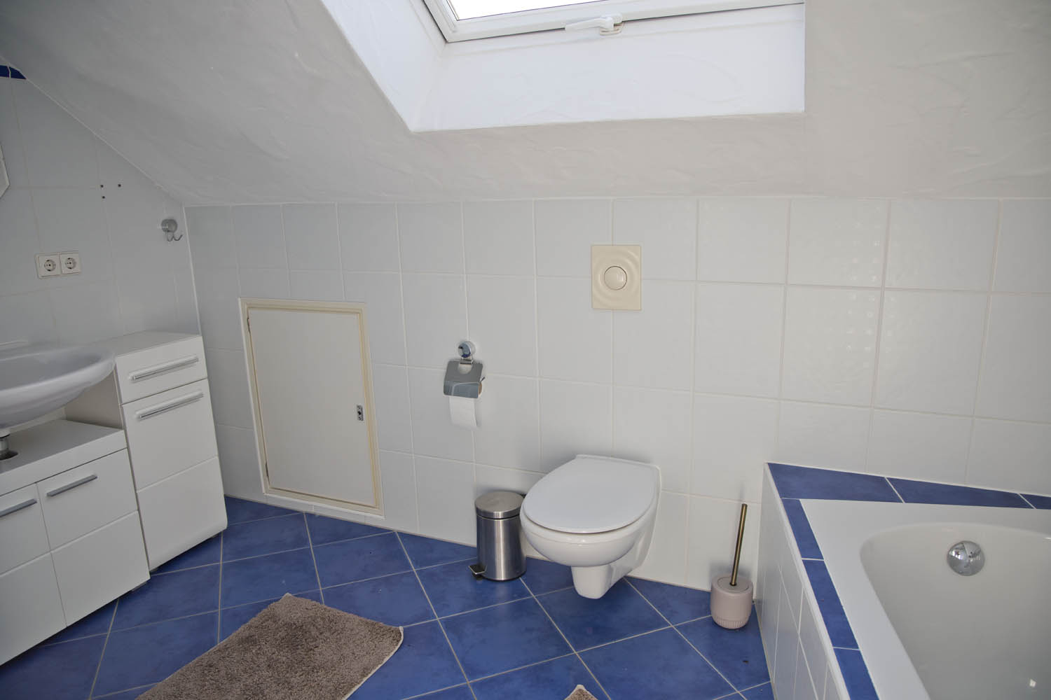 Die Wohnung hat ein Badezimmer mit Dusche, Badewanne & Fußbodenheizung. Das große Wohnzimmer grenzt direkt ans Essezimmer, Küche und Balkon.