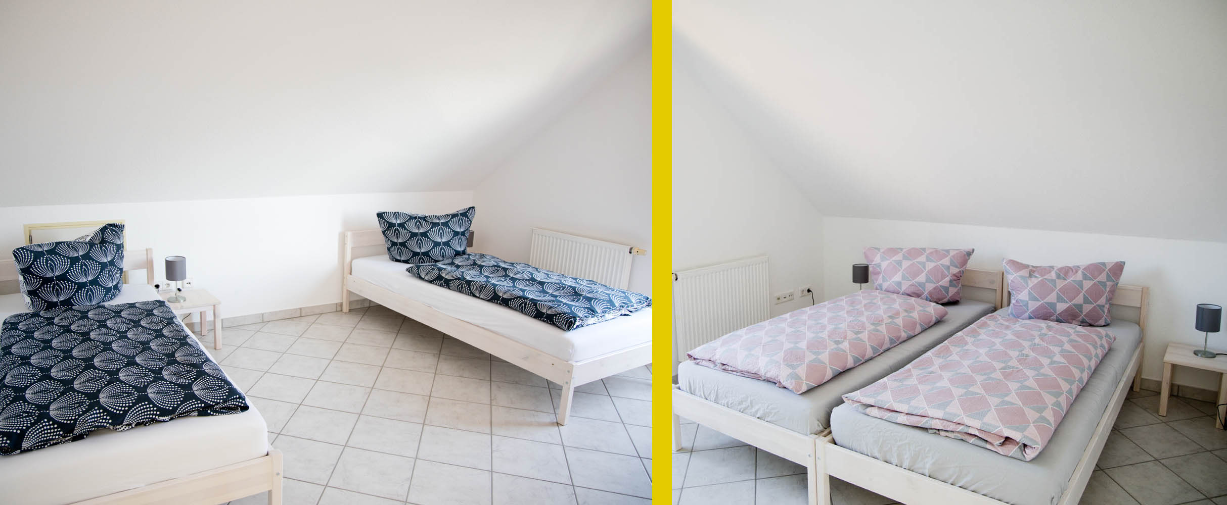 Wir bieten eine drei Zimmer Wohnung mit zwei hellen Schlafzimmern mit je zwei Betten (Wahlweiße Doppel- oder Einzelbetten).